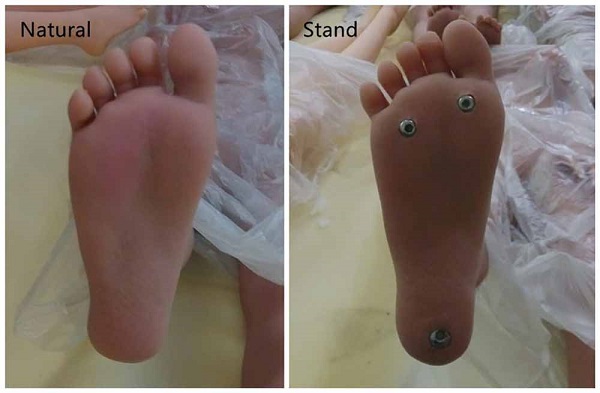 自立付きのタイプはバランスを取るために、ドールの足の裏にボルトの金具を取り付けます。